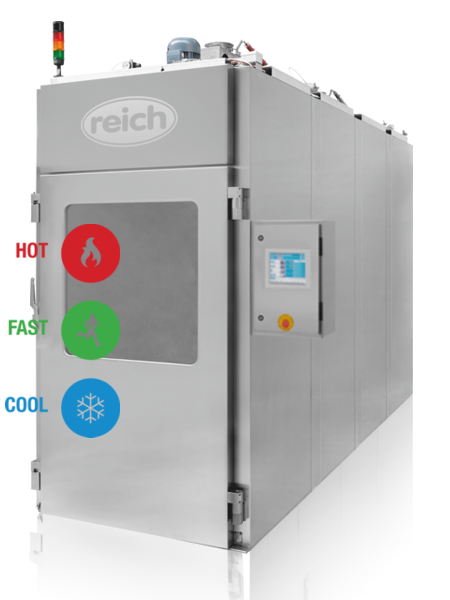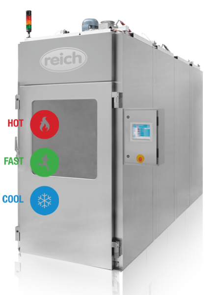 AIRMASTER® IC InterCooler работает по зарекомендовавшему себя принципу вертикальной циркуляции воздуха. При этом поток воздуха, подготовленного в верхней части установки, обтекает продукты снизу вверх. Новая система подачи воздуха гарантирует, что в любом положении в тележке камеры продукты обрабатываются равномерно и в кратчайшее время. По сравнению с конкурентами установки REICH оснащены более мощными вентиляторами и благодаря этому обеспечивают большую производительность и эффективность. По сравнению с серией UK в серии IC объем циркулирующего воздуха вырос еще больше.