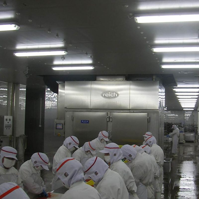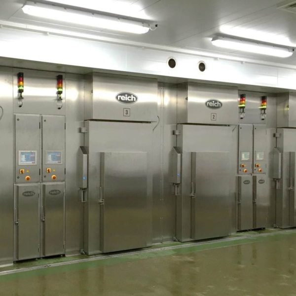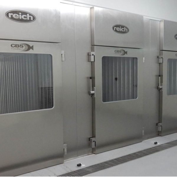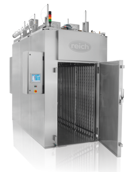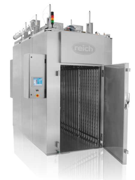 В установке технологический воздух бережно подается с одной стороны через специально разработанные направляющие. На противоположной стороне воздух снова вытягивается. При этом прочные воздухообменные клапаны с просторными свободными воздуховодами меняют направление притока и вытяжки каждую минуту. Благодаря вертикальному расположению отверстий для выхода воздуха можно изменять количество ярусов в тележке или расстояние между ними в зависимости от вида продуктов, это не повлияет на равномерность обработки. По сравнению с конкурентами установки REICH оснащены более мощными вентиляторами и благодаря этому обеспечивают большую производительность и эффективность. По сравнению с серией UK в серии UKQ объем циркулирующего воздуха вырос еще больше.