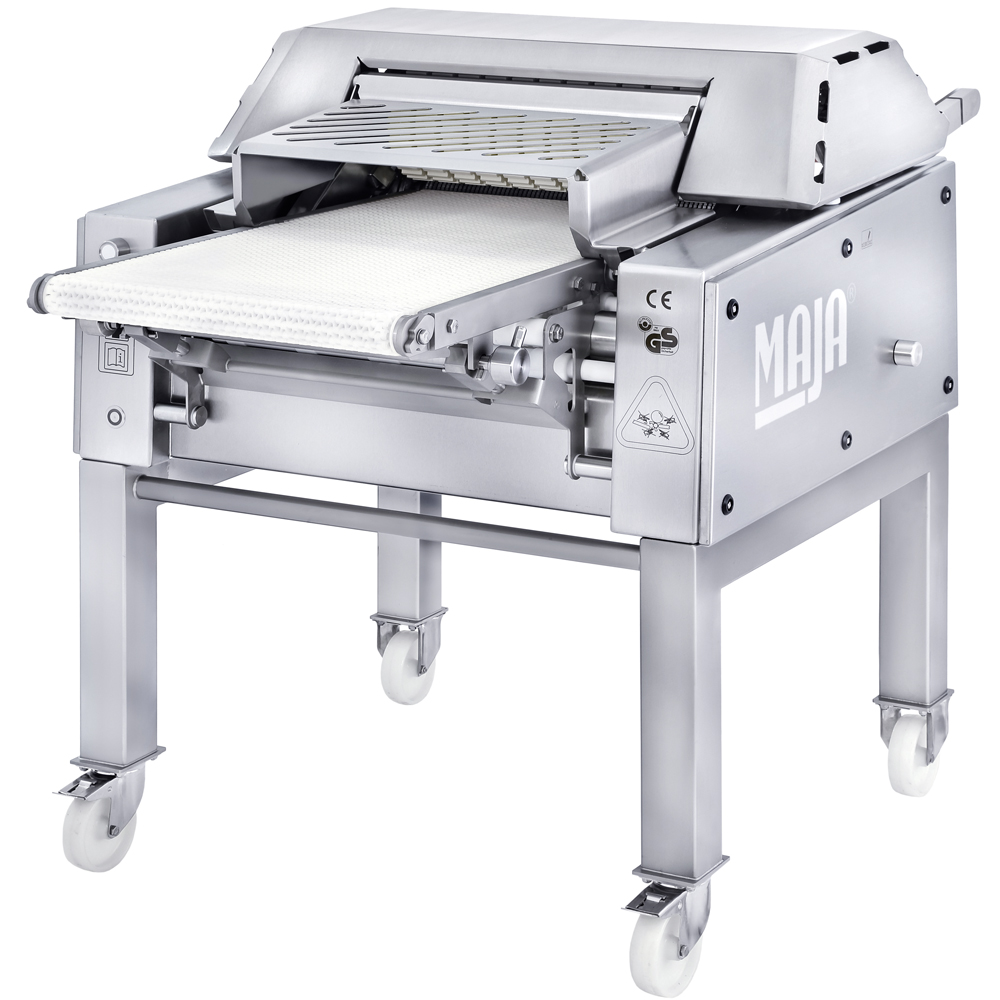 МАЙЯ ленточная машина для удаления шкурки BXAplus 434 предназначена для полностью автоматического процесса обработки частей свиной туши со шкуркой. МАЙЯ оборудование для снятия шкурки дает возможность получить оптимальный результат, прежде всего на срезе. Благодаря этому ручная доработка по удалению остатков шкурки сокращается до минимума. Это в свою очередь очень положительно отражается на гигиене продукта (меньше бактериального загрязнения вследствие контакта с продуктом).
